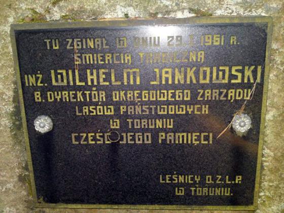 Tablica upamiętniająca śmierć inż. Wilhelma Jankowskiego, byłego Dyrektora Okręgowego Zarządu Lasów Państwowych w Toruniu.